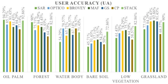 Regarding the classification through optical imaging, as shown by [3,63], the capacity to discriminate coverages based solely on SAR images does not attain the high accuracies that are possible to achieve using optical information of the study area. In addition to this, research such as those developed by [56,64,65] show that the overall accuracy (OA) using only the optical image is superior to that found using only the SAR image. However, in the classification of oil palm coverage, a significant decrease in user accuracy was observed compared with that obtained in the SAR image only, which corroborates the result obtained by [14], where they showed that it is possible to find higher accuracies in the classification of oil palm areas using SAR images compared with optical images.