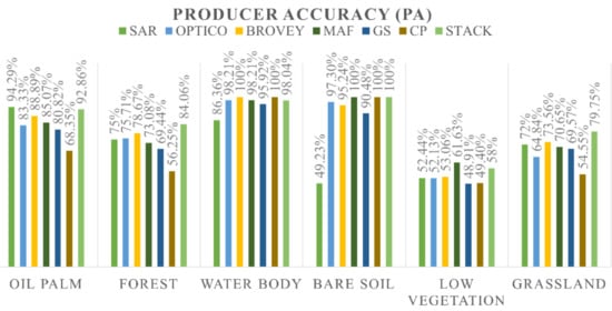 The overall accuracy (OA) obtained by the SAR image was slightly low compared with that obtained by the optical image, being 3.81% lower. However, it showed very high accuracies in the classification of oil palm and forest coverages, reaching 94.29% and 90%, respectively. This demonstrates the capacity of synthetic aperture radar (SAR) systems in land cover mapping, capturing global information day and night without being affected by atmospheric conditions, which is a significant limitation in the use of optical satellites. On the other hand, the Gram–Schmidt (GS) and principal components (PC) methods presented an overall accuracy (OA) lower than the optical image by 3.81%, 8.1%, and 2.15%, respectively.