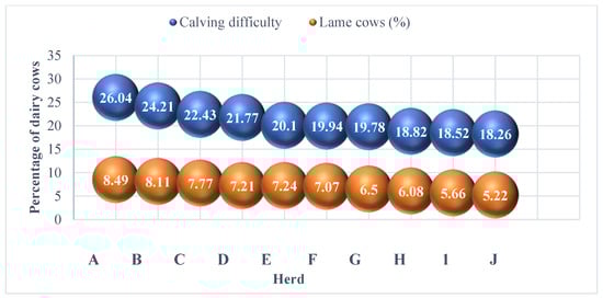 Percentage of dairy cows with dystocia at calving and lameness from 1 to 30 days after calving in different herds. A–J—Herd.