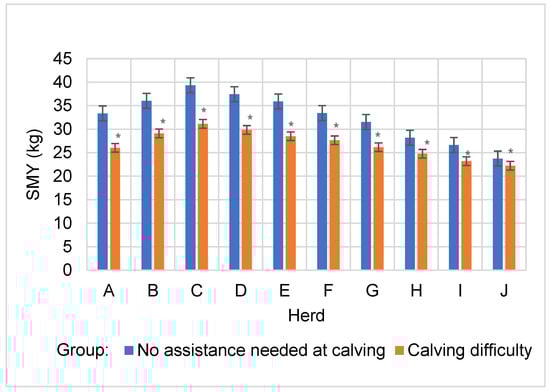 Standard milk yield of cows with and without assistance needed at calving from 1 to 30 days after calving in different herds. SMY: standard milk yield (0.4 × MY + 15 × MF × MY); Means within a herd that are marked with an * differ by p < 0.05. A–J—Herd.