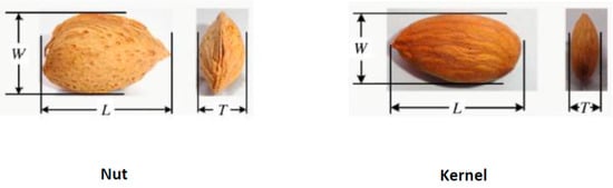 Considering the importance of the almond classification based on the forms [24], in order to characterize in advance the almonds for their nut traits, a sample of 50 almonds was tested measuring the nut length (L), width (W), and thickness, as shown in Figure 1.
