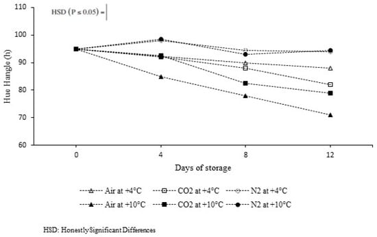 Hue angle (h) over 12 days of storage at +4 °C and +10 °C in air, 100 ± 1 kPa of CO2, and 100 ± 1 kPa of N2, respectively.