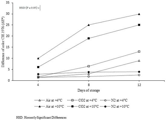 Color difference (ΔE*) CIE 1976 over 12 days of storage at +4 °C and +10 °C in air, 100 ± 1 kPa of CO2, and 100 ± 1 kPa of N2, respectively. The value “five” in the ordinate indicates the limit beyond which the human eye perceives strong color differences.