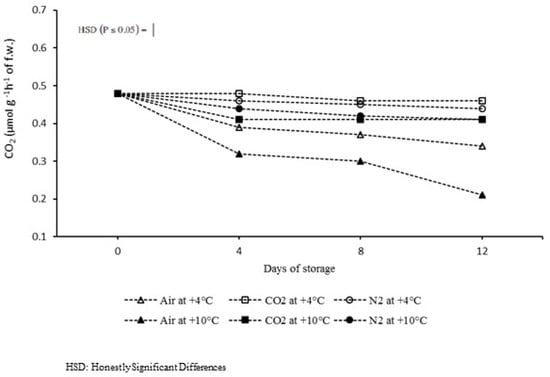 The nitrogen and carbon dioxide treatments confined the respiratory activity. Likewise, Wang et al. [46] also evidenced that a balanced concentration of O2 and CO2 in MA could inhibit the falling of fresh walnuts. All samples stored under MA at +4 °C and +10 °C exhibited a similar respiration rate, without being affected by the two different storage temperatures (Figure 4).