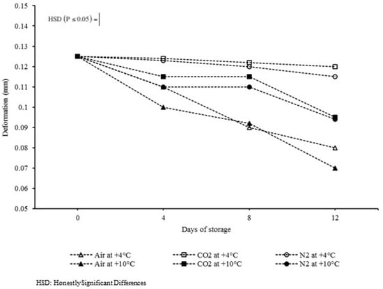 Deformation of almond kernels over 12 days of storage at +4 °C and +10 °C in air, 100 ± 1 kPa of CO2, and 100 ± 1 kPa of N2, respectively.