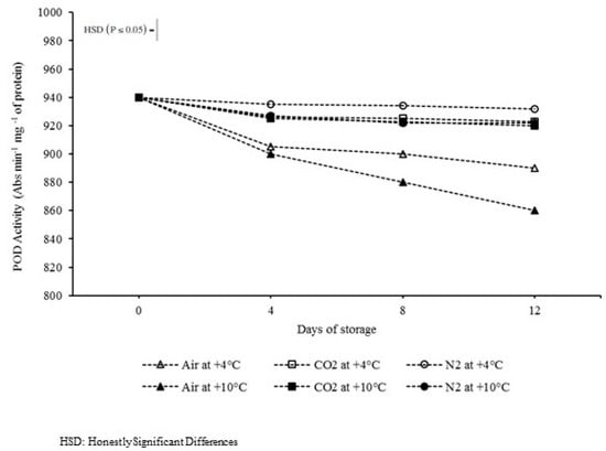 Peroxidase activity (POD) over 12 days of storage at +4 °C and +10 °C in air, 100 ± 1 kPa of CO2, and 100 ± 1 kPa of N2, respectively.