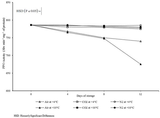 Polyphenoloxidase activity (PPO) 12 days of storage at +4 °C and +10 °C in air, 100 ± 1 kPa of CO2, and 100 ± 1 kPa of N2, respectively.