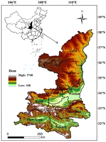 Shaanxi Province is located inland in the northwest (31°42′–39°35′ N, 105°29′–111°15′ E), in the marginal zone of the summer monsoon (Figure 1). With its complex and variable underlying surface and diverse climate types, it is part of the sensitive areas in terms of global climate change response. Bounded by the Beishan Mountains and the Qinling Mountains, the province consists of three major landform areas: the northern Shanbei Plateau, the Guanzhong Plain, and the Qinba Mountains. The special geographical conditions make Shaanxi province straddle the northern temperate and subtropical zones, with four distinct seasons and hot summer. In recent years, extreme high-temperature events occur frequently in summer, which has a serious impact on local agricultural production.