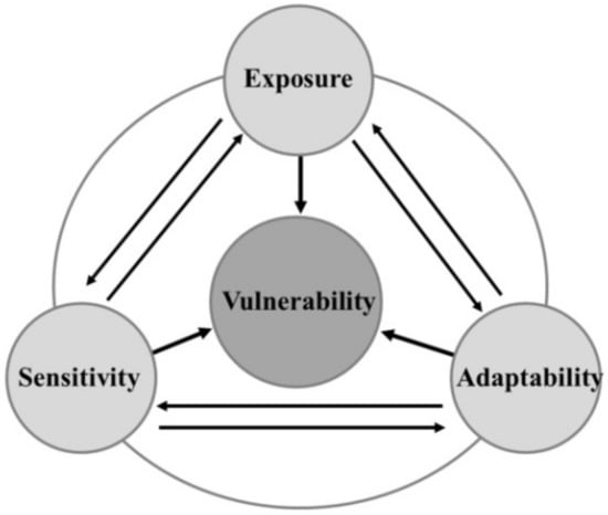 Vulnerability, as an important component of risk assessment, characterizes the degree of disaster suffered [,,]. The IPCC defines vulnerability as the degree to which a system is vulnerable or unable to cope with the adverse effects of climate change []. With the advancement of vulnerability research, vulnerability is considered to be the combined result of exposure, sensitivity and adaptability (Figure 2) [,].