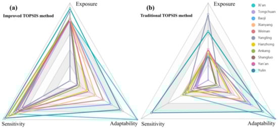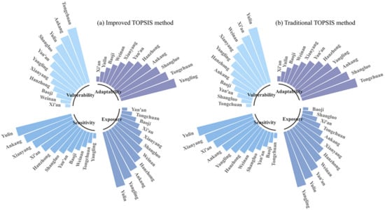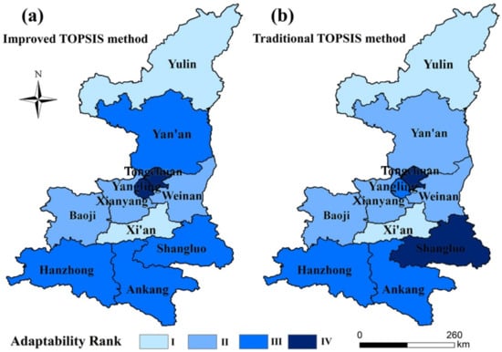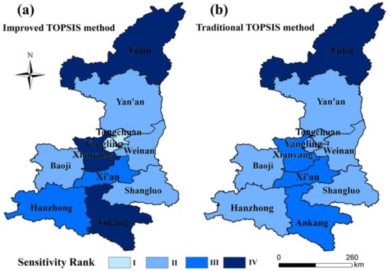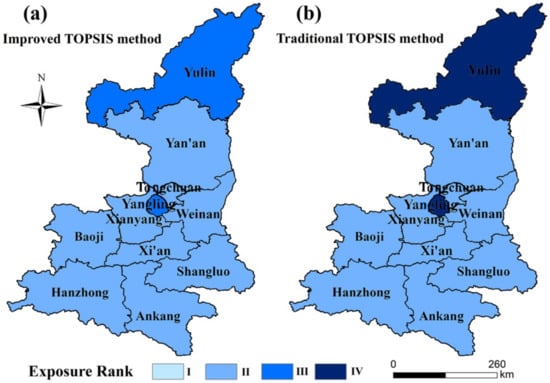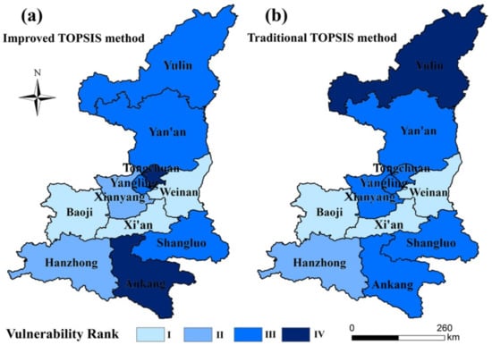 The rationality of the synthetical index method of the comprehensive risk assessment of agricultural heat damage in Shaanxi Province has been verified by scholars []. We compared the results with two TOPSIS results to verify the applicability and accuracy of the TOPSIS model for the assessment of vulnerability to high-temperature disaster in agriculture [,]. The vulnerability of the study area is: