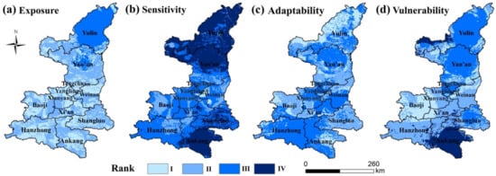 The mean value (V) and standard deviation (B) of vulnerability index obtained by the synthetical index method and TOPSIS model were calculated, respectively. The study area has been classified into four classes (Table 2). The zoning maps of exposure, sensitivity, adaptability and vulnerability to agricultural high-temperature disaster were drawn by ArcGIS 10.2.