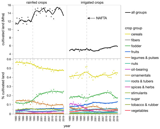 Overall, the total cultivated area in Mexico increased during the study period, especially after 1994 (Figure 1). For rainfed crops, the total cultivated area increased by about 15% after 1994, from 13 to as high as 15 million hectares (Mha). For irrigated crops, the total cultivated area increased at a slightly higher rate (20%), though the total area under irrigation was smaller (from 5 to 6 Mha). Cereals (mostly maize) comprised the largest share of rainfed croplands, though the share decreased steadily from 56% in 1980 to 46% by 2019. Fodder crops comprised the second-largest share of rainfed croplands, which steadily increased from 12% in 1980 to 24% by 2019.