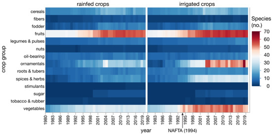 Number of rainfed and irrigated crop species (richness) for each crop group from 1980 to 2019. The arrow marks implementation of the North American Free Trade Agreement (NAFTA) in 1994.