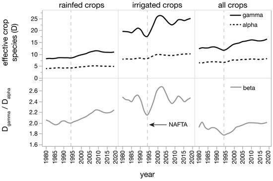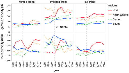 Changes in regional-level effective crop species diversity (D) among rainfed crops, irrigated crops, and all crops. Here, gamma diversity expresses total D in each region (North, North Central, Center, South), and beta diversity expresses dissimilarity in D among the states in each region. The dashed line marks implementation of the North American Free Trade Agreement (NAFTA) in 1994.