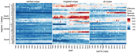 To answer these questions, yearly crop production data were used to calculate crop species richness (number of species) and effective diversity (alpha, beta, gamma) at state, regional, and national levels from 1980 to 2020. Data were obtained from publicly available government sources on the harvested areas (ha yr−1) of 304 crop species cultivated on rainfed and irrigated lands. Time series plots and heat maps of crop diversity measures were used to illustrate spatial and temporal changes during the study period. Findings were discussed in the contexts of agri-environmental policy and water resource management in Mexico and broader relationships between crop diversity and sustainability.
