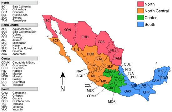 In this study, gamma-, alpha-, and beta-diversity calculations were made for: (1) rainfed cropped areas, (2) irrigated cropped areas, and together, (3) all cropped areas. Changes in species richness and effective diversity throughout the study period were illustrated at the state, regional, and national levels. Regional grouping of states followed the widely used Bank of Mexico classification, which divides the country into four main regions: North, North Central, Center, and South [42,43]. All analyses and illustrations were completed in JMP Pro 15.2.1. (SAS Institute, Cary, NC, USA).