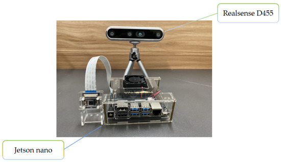 In this paper, we primarily focus on the object detection task in the image processing field. The image recognition module was a Jetson Nano embedded development board, as presented in Figure 1. The improved model algorithm, which was trained in advance, was embedded in the board, and wireless communications, remote monitoring, and remote control were achieved through the 4G network module. The communication system is mainly divided into the picking-machine end, cloud server end, and client end, ensuring the transmission and storage of information. Remote wireless control of the picking robot can also be achieved. In addition, the left and right imagers of the depth camera capture video or image data, which are sent to a depth imaging processor. This processor correlates points in the left image with those in the right image, and calculates the depth value of each pixel in the image by shifting the points in the left image to match with the right image. Finally, it returns the result to the terminal in order to command the manipulator to act accordingly.