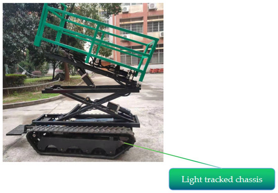 A test platform was independently developed by our team, which can be applied as a fruit picking and transferring platform in hilly and mountainous areas (Figure 2). The platform has a pure electric drive and a CAN interface for chassis speed regulation, steering, and attitude feedback. It is capable of stable driving and meets the hardware requirements of the platform positioning test for the chassis in hilly and mountainous areas.