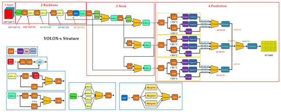 YOLOX [33] is a brand new high performance real-time target detection network, recently launched by Beijing Megvii Technology. It adopts cutting-edge technologies such as the anchor-free mechanism, decoupled heads, multi-positives, advanced label assignment strategy, and strong data augmentation. Hence, it has faster speed, higher recognition accuracy, smaller weight files, and can be easily mounted on mobile devices with lower configurations, thereby offering high research value. The structure of the YOLOX-S network selected for this paper is depicted in Figure 3.
