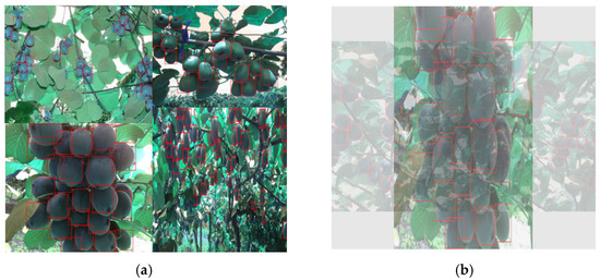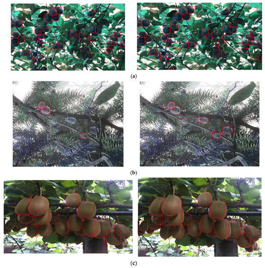 Figure 11 presents the before and after images for comparison. By comparing the groups of images, it can be seen that in the (Figure 11a) group of experiments, the fruit could be effectively identified by the enhanced model, even when there were tree trunks, branches, and leaves in the way.