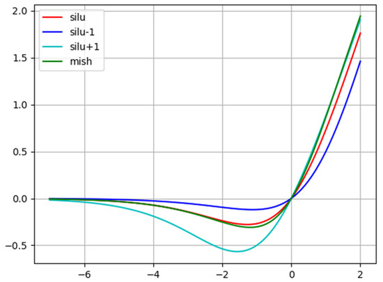 The predominant function of the activation function is to provide non-linearity in the network structure. Considering that the difference between the gradient propagation effects of the SiLU and Mish loss functions utilized in the YOLOX model is slight, gradient perturbation was considered based on the SiLU activation function. As presented in Figure 5, the SiLU→SiLU-1 gradient change led to a smoother curve, while the SiLU→SiLU + 1 gradient change became steeper. Given that the Mish activation function worked relatively well in YOLOv4, it was considered to increase or decrease the gradient change based on SiLU. Introducing a gradient increase can enhance the generalization ability of the model more robustly, and as such, we found that the SiLU + 1 activation function enhanced the generalization ability of the model to a certain extent.