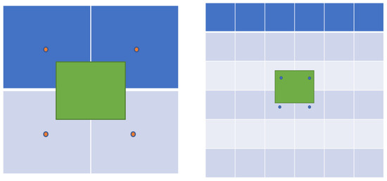 The dynamic positive and negative sample allocation algorithm utilized by YOLOX, SimOTA, is fast and effective. When determining the candidate areas for positive samples, the center point of a grid (20 × 20, 40 × 40, 80 × 80) was selected as the circle inside the ground truth (GT), with r being the radius centered on the center point of the GT. In Figure 6, the green box denotes the GT. It can be observed that there may be mismatches when using a small feature map. Subsequently, it can be observed that GTs are more likely to match smaller GTs in larger feature maps, but small feature maps can match a significantly small number of GTs.