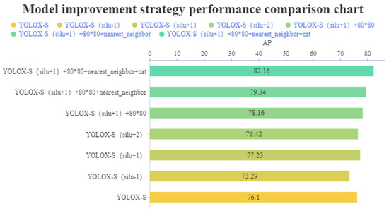 In order to efficiently verify the effectiveness of the proposed model, a comparative experiment was conducted on the enhanced YOLOX-S network using the same training parameters. Table 2 provides the detailed scores of each evaluation index before and after the enhancement. Figure 9 presents the AP diagram of the model before and after enhancement.