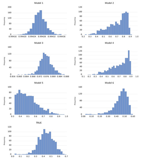 Histograms of TE for Models 1–6 and True parameters.