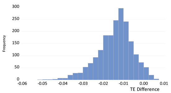 Histogram of the differences of TE scores. The differences mean that the estimated TE scores of Model 6 subtract true TE for the opposite simulation.