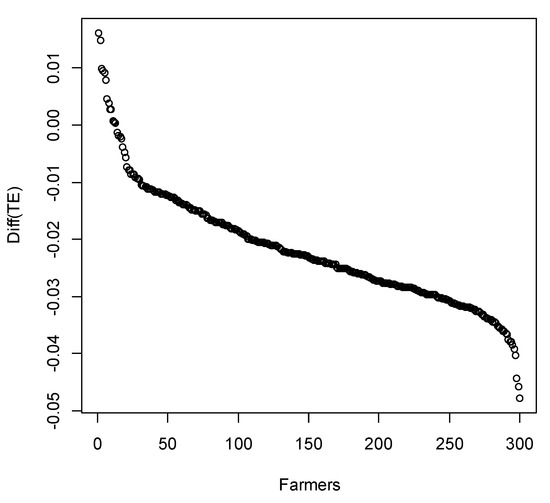 The distribution of technical efficiency scores and the summary statistics are presented in Table 4 for the conventional SFM with heterogeneity and R-Clayton 90° SFM with dependent error components and heterogeneity. It is clear from Table 4 that the conventional SFM with heterogeneity overestimates technical efficiency levels, and there are differences in the distribution of individual farmers within individual technical efficiency intervals in this case. The mean technical efficiency score from the copula-based model is significantly lower by two points (p < 0.01). In the copula-based SFM with dependent error components and heterogeneity, 29.3% of the farmers are operating at efficiency level of 91% or above, whereas the corresponding figure is 42.3% in the conventional SFM with heterogeneity. Figure 3 presents the cumulative distribution of the technical efficiency scores of the conventional SFM with heterogeneity and copula-based SFM with dependent error components and heterogeneity, which shows large differences as well. Table 5 presents the shifts in the relative ranks of the top five and bottom five farmers with respect to technical efficiency scores between the conventional SFM with heterogeneity and the copula-based SFM with dependent error components and heterogeneity, thereby, confirming the trends shown in Figure 3. Figure 4 shows the differences of technical efficiency scores between the copula-based SFM with dependent error components and heterogeneity and the conventional SFM with heterogeneity. We can see that the technical efficiency scores are mostly overestimated as compared to the conventional SFM with heterogeneity. Finally, Table 6 shows that the maximum level of difference in efficiency score is five points and the minimum level of difference is two points between the conventional SFM with heterogeneity and copula-based SFM with dependent error components and heterogeneity, respectively.