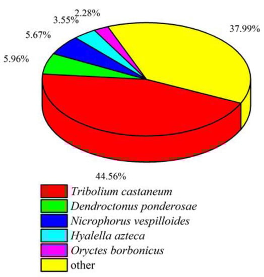 To understand the similarity of gene sequences between P. quatuordecimpunctata and other related species, unigene sequences of P. quatuordecimpunctata were compared and annotated with the NR database (Figure 1). We found that 44.56% of the gene sequences of P. quatuordecimpunctata were the same as the genome of Tribolium castaneum (Herbst), proving that it and T. castaneum have high similarity and share a close genetic relationship.