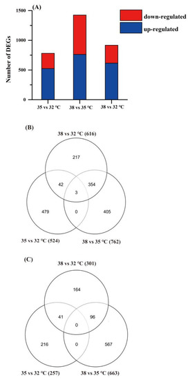 Differentially expressed genes (DEGs) in P. quatuordecimpunctata under different temperature stress. (A) Total numbers of individual transcripts that were significantly up- or downregulated in different temperature groups. (B) Venn diagram illustrating the number of upregulated genes in the different temperature groups. (C) Venn diagram illustrating the number of downregulated genes in the different temperature groups.