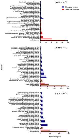 A large number of DEGs were identified from P. quatuordecimpunctata after different temperature treatments. According to the enrichment significance (p-value), a histogram was drawn for the first 30 GO terms of P. quatuordecimpunctata (Figure 3). In all groups, all DEGs were found to be mainly enriched in two categories: biological processes and molecular functions. In the 35 vs. 32 °C groups, the DEGs were mainly enriched in the “carbohydrate metabolic” pathway (7 upregulated genes and 4 downregulated genes) of biological processes and the “catalytic activity” (74 upregulated genes and 17 downregulated genes) and “hydrolase activity” pathway (36 upregulated genes and 6 downregulated genes) of molecular functions (Figure 3A, Supplemental Table S1). However, in the 38 vs. 35 °C groups, the DEGs were mainly enriched in the area of “small molecule metabolic process” (33 upregulated genes and 9 downregulated genes) and “oxidation−reduction” pathways (31 upregulated genes and 5 downregulated genes) of biological processes, as well as the “catalytic activity” (124 upregulated genes and 61 downregulated genes) and “oxidoreductase activity” pathways (49 upregulated genes and 9 downregulated genes) of molecular functions (Figure 3B, Supplemental Table S1). These results suggest possible reasons for the differences in the response of P. quatuordecimpunctata to different high temperatures (35 and 38 °C).