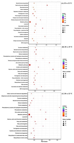 The enrichment analysis based on KEGG was used to further resolve the mechanism of thermotolerance in P. quatuordecimpunctata. The DEGs of the 35 vs. 32 °C groups, the 38 vs. 35 °C groups, and the 38 vs. 32 °C groups were enriched to 183, 180, and 164 KEGG metabolic pathways, respectively. Here, we showed the top 20 most significant “metabolic pathways” that were enriched (Figure 4). “ABC transporters”, “Ascorbate and aldarate metabolism”, “Chemical carcinogenesis”, “Drug metabolism−other enzymes”, “Metabolic pathways”, “Pentose and glucuronate interconversions”, “Retinol metabolism”, “Starch and sucrose metabolism”, and “Steroid hormone biosynthesis” were the co-enriched pathways in the 35 vs. 32 °C and 38 vs. 35 °C groups (Figure 4, Supplemental Table S2). The DEGs involved in “Metabolic pathways” were further analyzed. Most of the DEGs (35 genes) of the metabolic pathways were obviously upregulated in 35 vs. 32 °C, and only a few DEGs (7 genes) were obviously downregulated in 35 vs. 32 °C. Similarly, most of the DEGs (87 genes) of the metabolic pathways were obviously upregulated in 35 vs. 32 °C, and only a few DEGs (26 genes) were obviously downregulated in 35 vs. 32 °C (Supplemental Table S2).