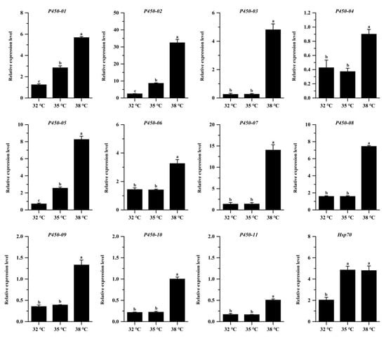Through functional enrichment analysis, a large number of DEGs related to heat resistance were found (Supplemental Tables S1 and S2). We selected twelve DEGs (eleven P450 and one Hsp70) of interest for qRT-PCR verification. The FPKM values of DEGs obtained by sequencing are shown in Table 4.