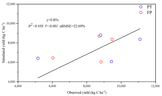We carried out site verification under two agricultural practices to verify the applicability of the DNDC model in the study area. Modeled crop yields were in good agreement with observations for both the calibration (FP during 2015–2016) and validation (FP during 2016–2017 and PT during 2015–2017) datasets (Figure 1). The calculated statistical indices (R2 =0.96, p < 0.001, nRMSE = 22.69%) indicated that the simulated crop yields were significantly correlated with observed values. However, the slope of the zero-intercept linear equation was 0.85, indicating that our simulated values were lower than the observed crop yields.