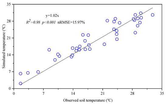 The modeled soil temperature data were also generally comparable with the observed values (Figure 2). The R2 of the linear regression of simulated against observed data was 0.98, and nRMSE was 15.97%, indicating that the simulated values had high simulation reliability in the trend and range of soil temperature variation. In addition, the DNDC model overestimated the soil temperature in several periods.