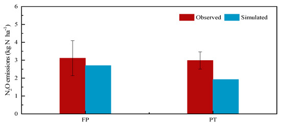Based on a comparison of the simulated annual cumulative N2O emissions under FP and PT treatments (2.70 and 1.92 kg N ha−1, respectively), the observed values showed a small discrepancy due to overestimation (Figure 3). However, the nRMSE with a value of 26.51% demonstrated that the simulation deviations were within an acceptable range (nRMSE < 30%) [27].