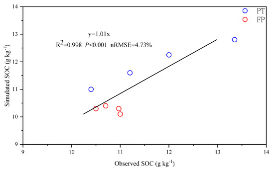 As Figure 4 shows, the simulations of the soil SOC from the DNDC model were close to the corresponding field observations (nRMSE = 4.73%). A significant zero-intercept linear regression (slope = 0.98, R2 = 0.99, p < 0.001, n = 8) was obtained to relate the simulations of the SOC to the corresponding observations. Furthermore, different trends of SOC change existed in the two treatments, which illustrated that the DNDC model could capture and distinguish management options well.
