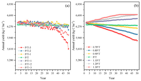 Crop yields under different temperature climate scenarios were basically at a relatively stable level (Figure 5), with baseline (P/T) ranging from 6305.54 to 6334.50 kg C·ha−1. Crop yields had an obvious increasing (decreasing) trend over time under the increased (decreased) precipitation scenarios. The P/T−3 and P/T+3 scenarios reached the lowest yields in the 50th year, at 5615.03 and 6024.420 kg C·ha−1, respectively, a reduction of 4.46% and 10.95% compared with the baseline. There was no obvious yield reduction under the remaining temperature scenarios.