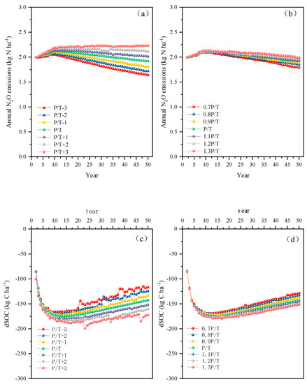 Overall, SOC changes in baseline ranged from −174.68 to −85.43 kg C-ha−1. Figure 6c,d illustrates that increasing temperature and decreasing precipitation promoted SOC loss. For all climate change scenarios, the annual dSOC was the lowest under P/T+3 and 1.3 P/T, reaching −172.03 kg C-ha−1 and −128.37 kg C-ha−1, respectively, in the 50th year. The highest dSOC was measured in P/T−3 and 0.7 P/T+3, but the overall loss was less than zero, which indicated that SOC was lost.