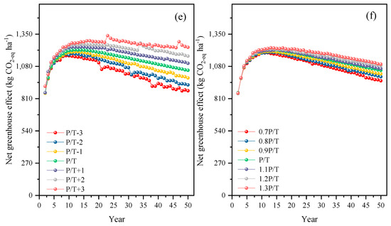 The net greenhouse effect of the baseline ranged from 853.58 to 1204.50 kg CO2-eq-ha−1. (Figure 6e,f). Along with the increase in temperature or precipitation, the greenhouse effect increased, being the lowest under P/T−3 or 0.7 P/T and the highest under P/T−3 and 1.3 P/T. The trends changed under the scenarios of temperature change and precipitation change, with a sharp increase in the first ten years but a slow decrease on a long-term basis. However, the values of the net greenhouse effect were all positive, leading to climate warming.
