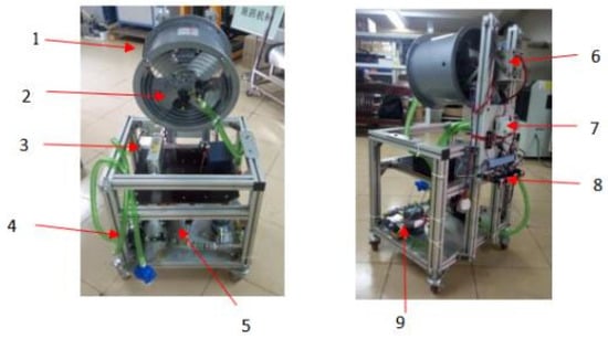 Self-developed axial-flow air-assisted platform: (1) axial fan; (2) nozzle; (3) power supply; (4) pump; (5) manometer; (6) frequency converter; (7) fan switch; (8) button; (9) flow meter.