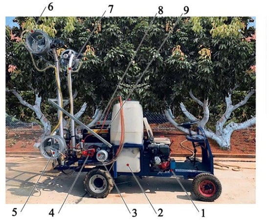 Display of the self-created axial-flow air-assisted sprayer: (1) vehicle platform; (2) pesticide box; (3) electric motor; (4) liquid pump; (5) axial-flow fan; (6) ring-like nozzle group; (7) adjustable profile strut; (8) control cabinet; (9) gasoline generator.