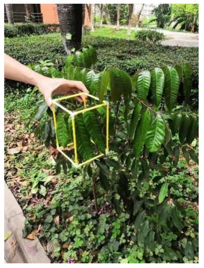 In this experiment, a cubic frame (Figure 4) of 30 cm × 30 cm × 30 cm was inserted into different measurement areas of a canopy for sampling using foliage area volume density (FAVD) as the key variable. The total number of leaves and the area of the leaves on one side were counted and recorded [22]. For calculating the sampled leaf area, the leaf was placed on a positioning plate, and Photoshop software was used for imaging and editing. The foliage area volume density was calculated using the following formula: