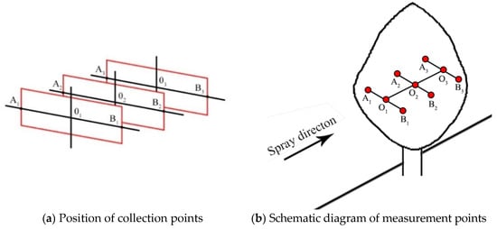 Before testing, the axial-flow air-assisted sprayer was positioned in front of a target tree, and the profile strut and fan angle were adjusted such that the fan’s axis and the center of the tree canopy were aligned horizontally. During testing, the air-assisted device was first started. Then, the spray supply device was initiated after the airflow velocity was stable. Upon reaching a set spray volume, the air-assisted device and spray supply device were suspended. For the collection of droplets, a circular absorbent paper with a diameter of 7 cm was placed on the windward side of the tree canopy. A three-layer sampling strategy was adopted, and three measuring points were set at the left, middle, and right of each layer. The layout of the collection points is shown in Figure 5. Droplet retention was obtained by weighing the absorbent paper using a high-precision electronic balance, providing a basis for investigating the attenuation characteristics of droplets along the spray direction. The droplet penetration ratio Pd was calculated using the following equation: