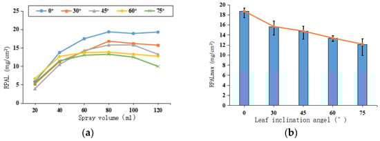 (a) Patterns of RPAL against spray volume under various leaf inclination angles; (b) maximum RPAL against leaf inclination angle.