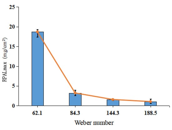 where is the droplet density, is the droplet size, is the speed of droplets before collision, and is the liquid surface tension. In this test, the working parameters of the platform were not changed; thus, of the droplets was considered to be the same, as calculated from two continuous pictures taken using a high-speed camera (). The Weber numbers are shown in Table 9.