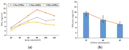 Effect of airflow velocity on RPAL: (a) RPAL against spray volume under different airflow velocity; (b) relationship between airflow velocity and RPALmax.