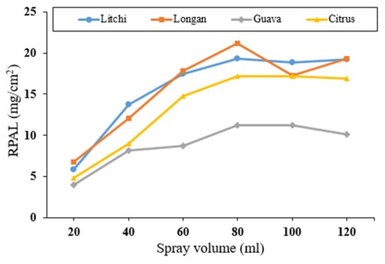 Taking litchi leaves as an example, Figure 6a shows the patterns of RPAL against spray volume under various leaf inclination angles. When spray volume ranged from 20 to 80 mL, the RPAL increased gradually and reached the maximum at a spray volume of around 80 mL. When the spray volume was greater than 80 mL, the RPAL no longer increased or even started to fall with a continuous increase in spray volume. The cause of this phenomenon was that some liquid drops that were gradually merged with smaller droplets rolled off the leaves when their gravity exceeded their cohesive force with continuous spraying, resulting in droplet retention loss [23]. On the other hand, the RPAL decreased with an increase in leaf inclination angle, which agrees with previous findings.